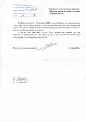 энергетик пв Опубликовано 6 Декабря 2012 Жалоба Опубликовано 6 Декабря 2012 А что если не ограничиваться одним обращением. Ну например в суды Алматы поступят одновременно несколько таких заявлений? Готов в любой из судов также направить соответствующее заявление. Считаю, что такой придаст обращениях характер массовости, что может быть более эффективно.